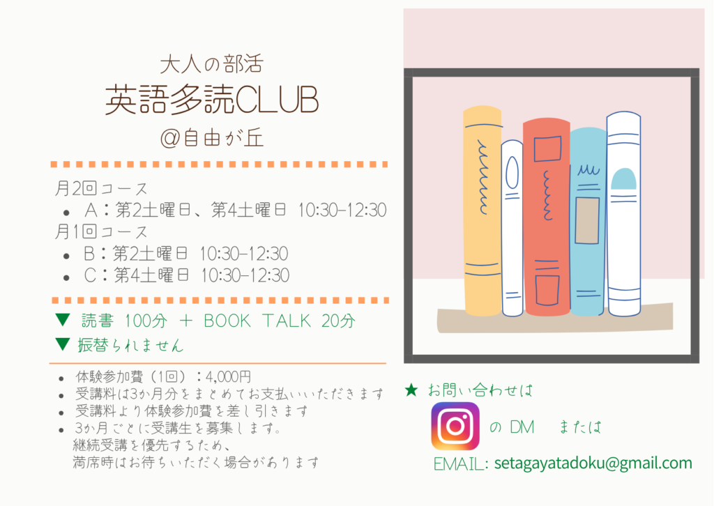 英語多読CLUB 大人のための英語多読CLUB 社会人、大学生対象の英語多読クラブです。★英語が読めるようになりたい!★多読を始めたいけれど・・・★おもしろい英語の本が見つからないそんな大人たちが集まってワイワイと英語の本を読んでブックトークをしています講師は多読指導で実績があり気軽になんでも聞けます 大人の部活-英語多読CLUB-2026 最寄駅: 自由が丘駅 OR 奥沢駅 (東京)当教室までのアクセス 問い合わせは Instagram のDMまたはEMAIL: setagayatadoku★gmail.com(★を@に変更してください) すべて Gallery 多読講座 月2回コース A:第2 & 第4 土曜日 10:30-12:30月1回コースB:第2土曜日 10:30-12:30C:第4土曜日 10:30-12:30 *読書 100 分 + Book TALK 20分 *振替えられません 体験参加費(1回):4,000円受講料は3か月分をまとめてお支払いいただきます受講料より体験参加費を差し引きます3か月ごとに受講生を募集します継続受講を優先するため、満席時はお待ちいただく場合があります 問い合わせは Instagram のDMでまたはEMAIL: setagayatadoku★gmail.com(★を@に変更してください)